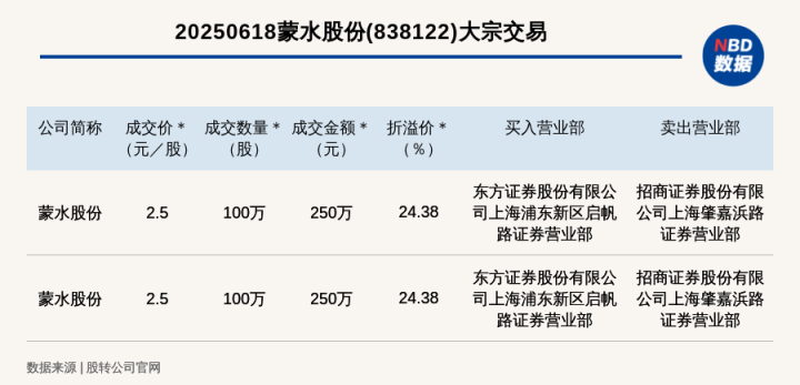 配资专业证券配资门户 新三板基础层公司蒙水股份发生2笔大宗交易, 总成交金额500万元